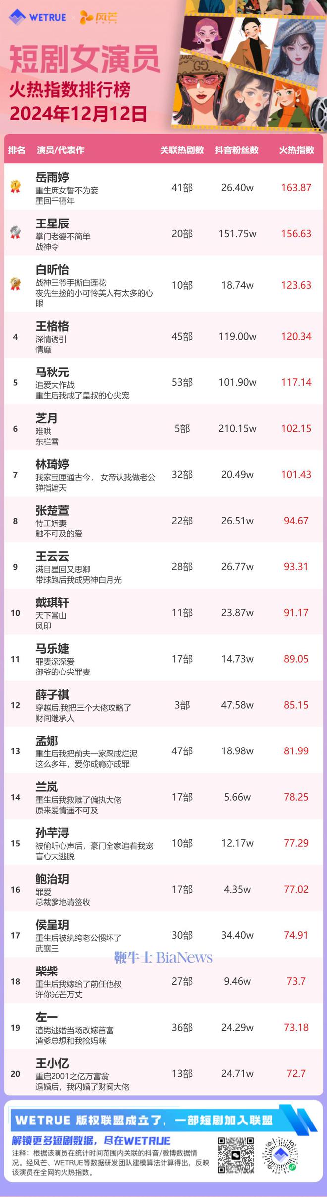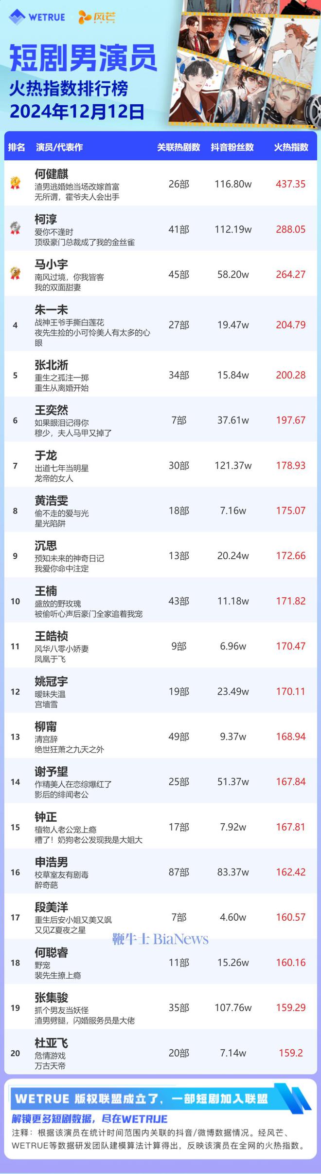 12月13日消息,为帮助短剧从业者提供更多信息★★★,专注于短剧报道的新腕儿和科技媒体鞭牛士联合WETRUE短剧热度榜共同推出多种短剧热度榜。